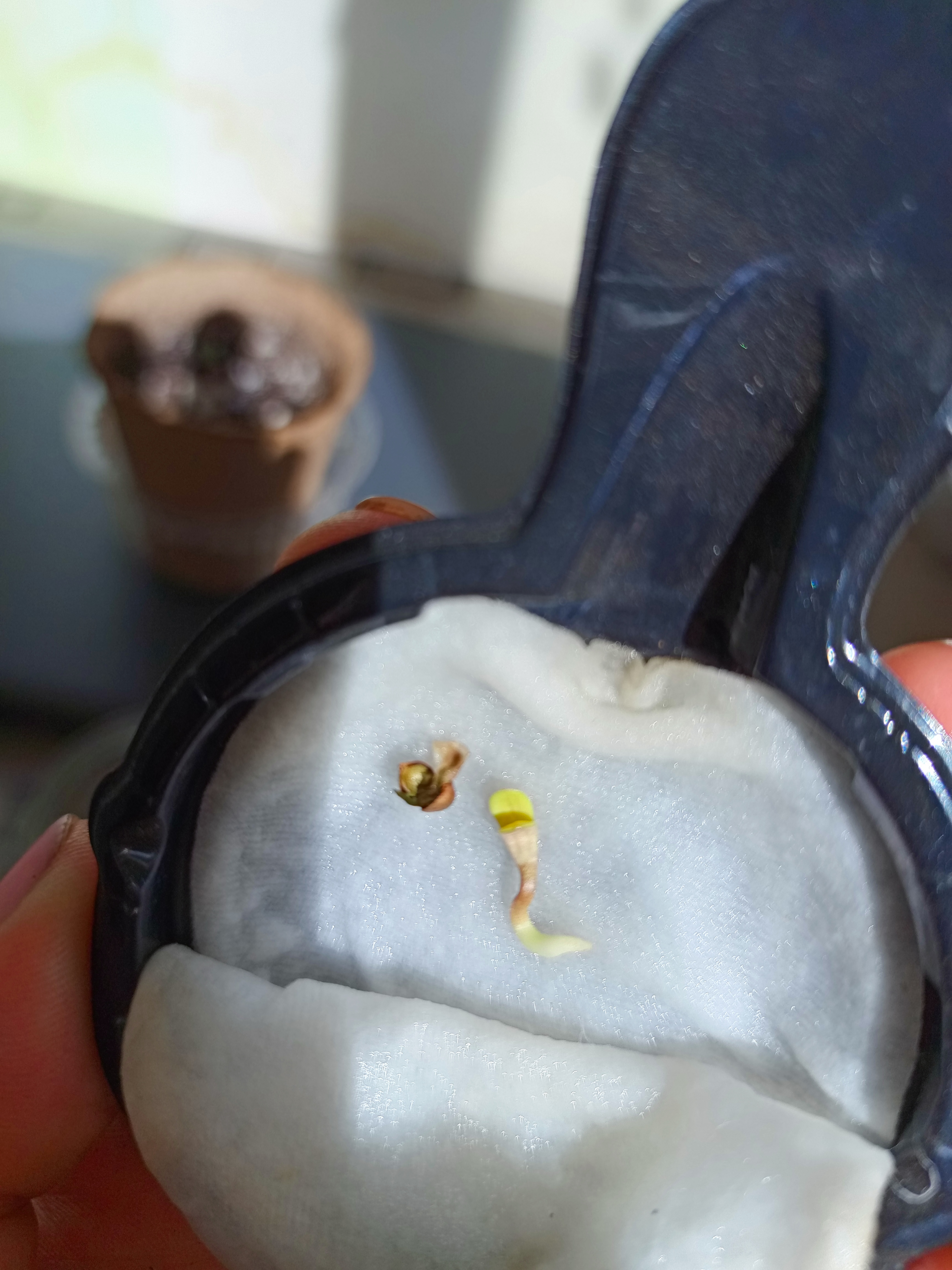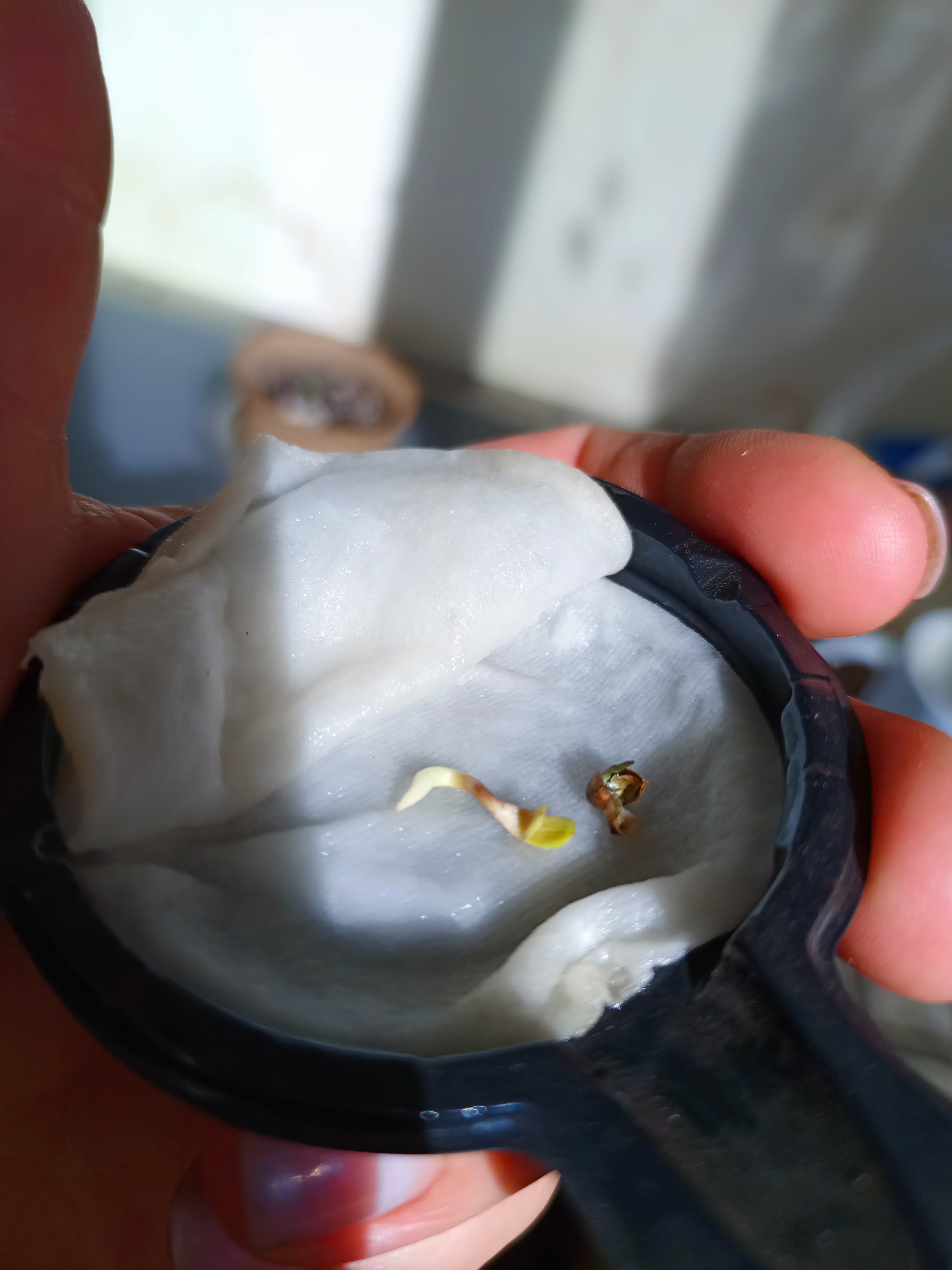 Амнезия 1 из 2 семечек которых я вообще в своей жизни ращу. Пока об уходе и прихотливости сказать ни чего не могу, буду со временем дополнять отзыв. Впечатления пока только положительные. Прилажию фото. На первом семечка дала трещину через 4-5 часов как положили в спонжик. На втором фото на 3 сутки, в день посадки, сама пробилась,пленка слезла без проблем. Посадка была 01.10. Последнее фото 05.10